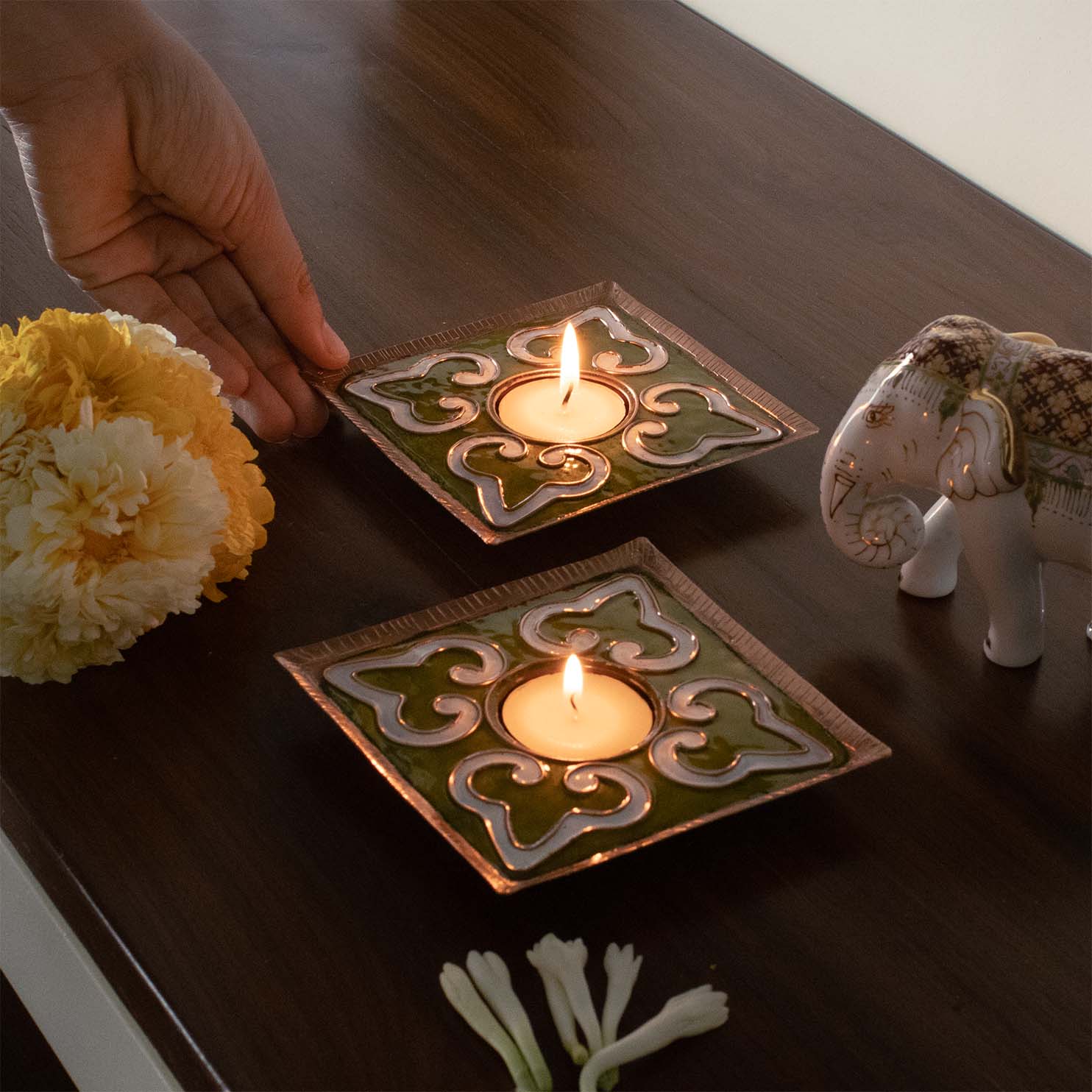 EkiBeki Handcrafted Tealight holder Rangoli Parrot Green Square (Set of 2)