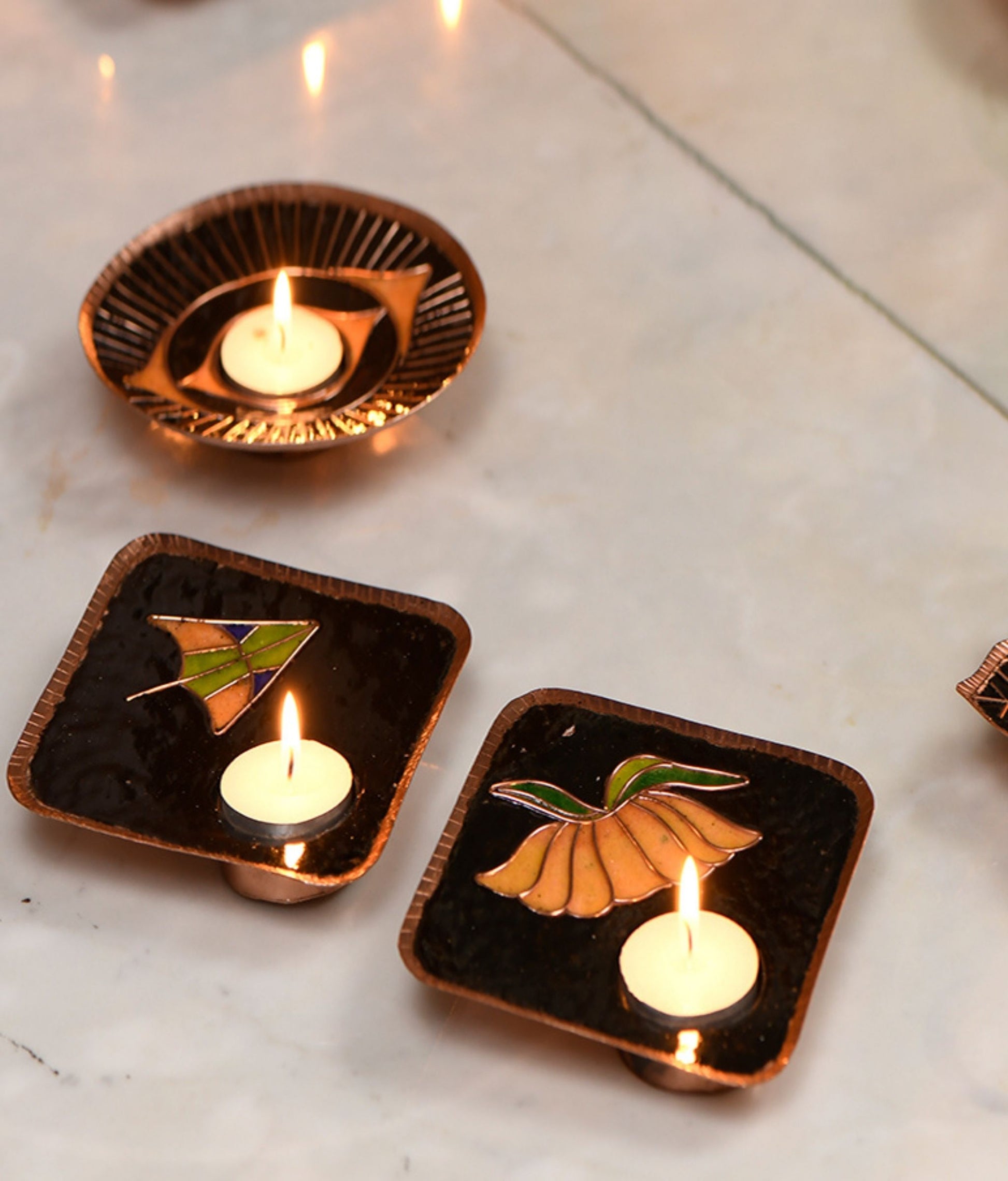This collection of handmade copper enamel wallplates and tealights is inspired by the festival of Makar Sakranti. Makar in Sanskrit is Capricorn and Sankranti means change of Sun’s abode from one zodiac sign to another. Makar Sankranti marks the end of Dakshinayana or Sun’s southward journey and start of Uttarayana - start of the northward journey.